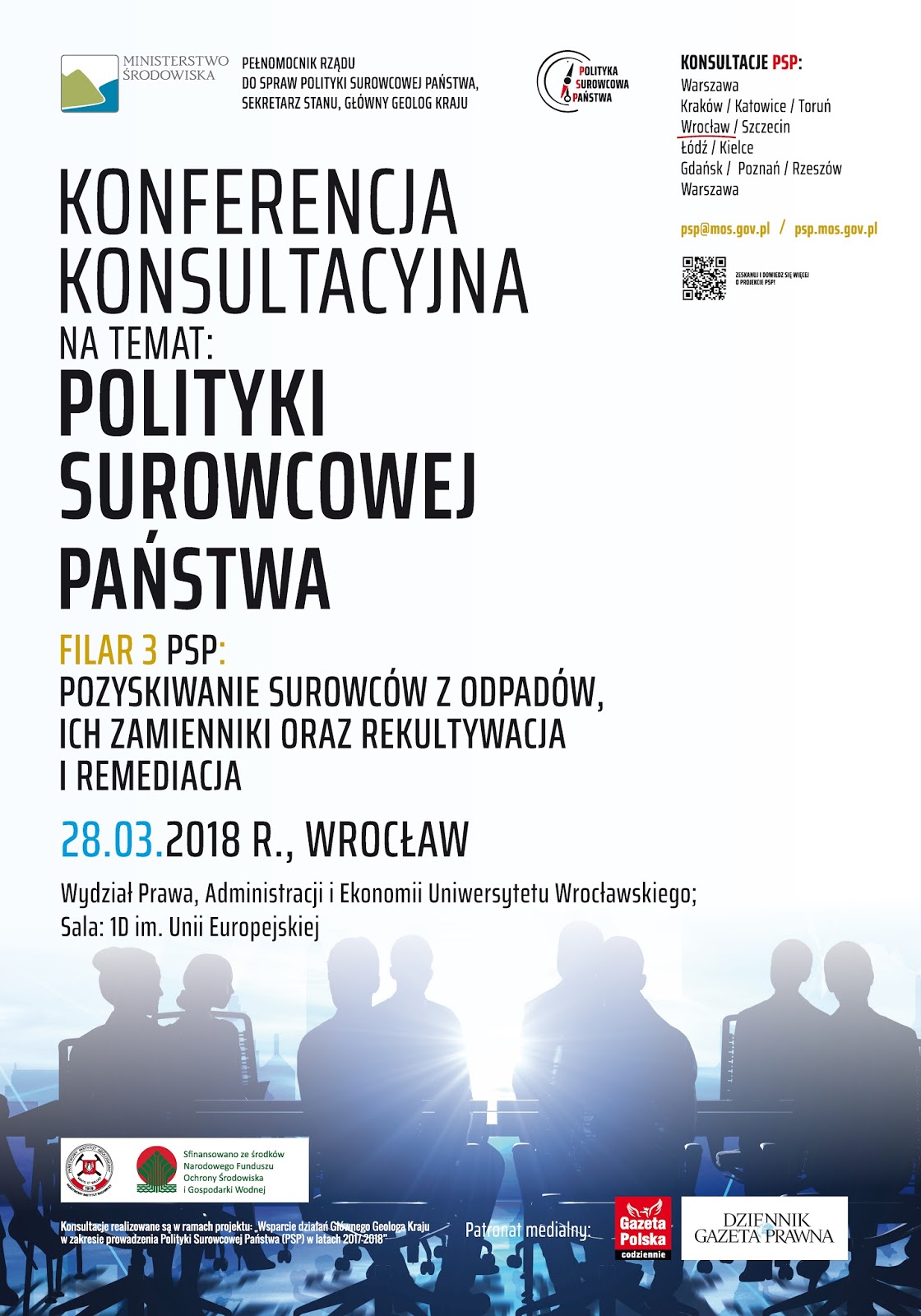 W imieniu Państwowego Instytutu Geologicznego – Państwowego Instytutu Badawczego serdecznie zapraszamy do udziału w regionalnej konferencji konsultacyjnej dotyczącej projektu Polityki Surowcowej Państwa (PSP), która odbędzie się we Wrocławiu, 28 marca 2018 r. w godz. 10.30-16.00 na Wydziale Prawa, Administracji i Ekonomii, Uniwersytetu Wrocławskiego, ul. Uniwersytecka 7, sala 1D im. Unii Europejskiej.
